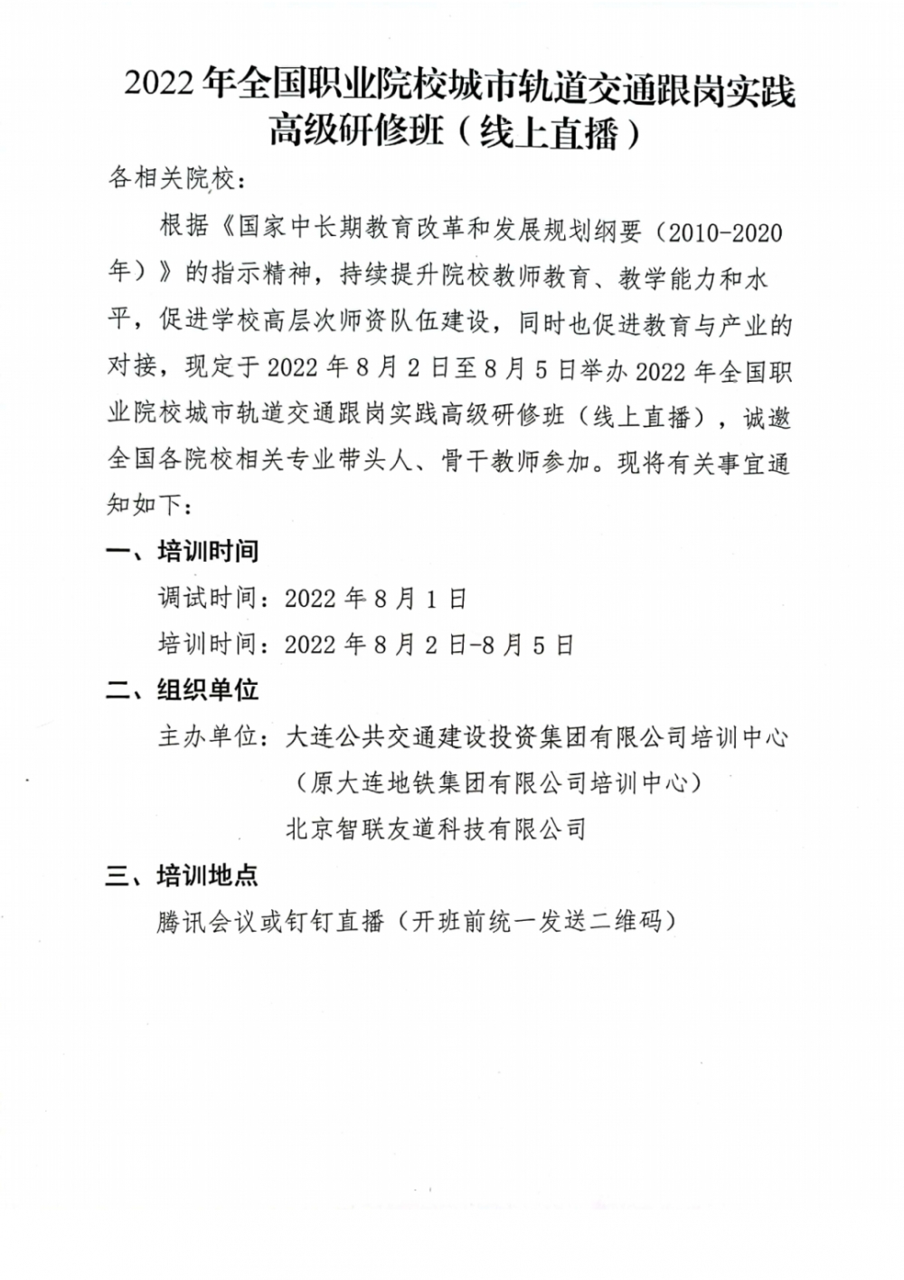 根据《国家中长期教育改革和发展规划纲要(2010-2020年)》的指示精神,持续提升院校教师教育、教学能力和水平,促进学校高层次师资队伍建设,同时也促进教育与产业的对接,现定于2022年8月2日至8月5日举办2022年全国职业院校城市轨道交通跟岗实践高级研修班(线上直播),诚邀全国各院校相关专业带头人、骨干教师参加。现将有关事宜通知如下: