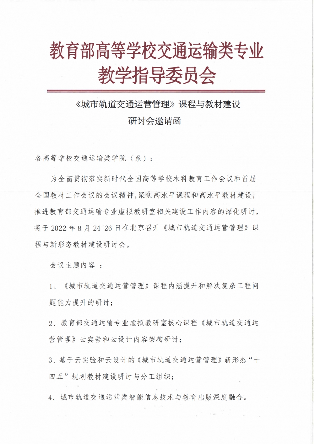 邀请:《城市轨道交通运营管理》课程与教材建设研讨会